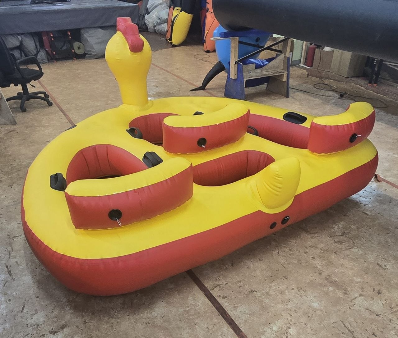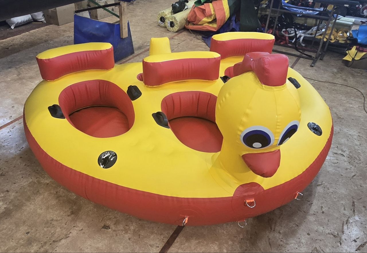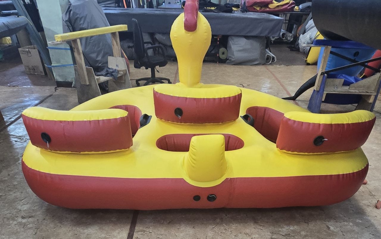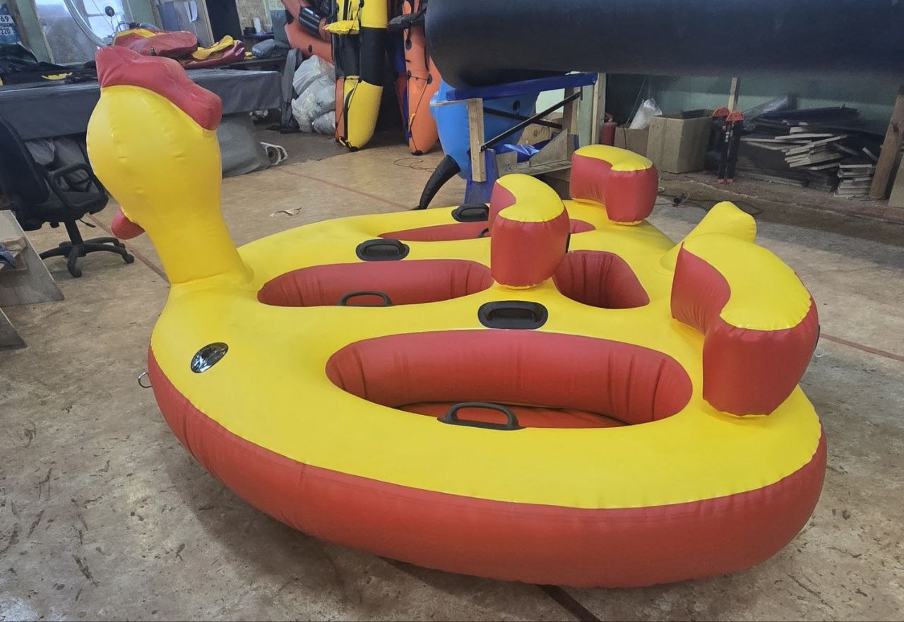 Водная ватрушка — это аттракцион как для личного использования, так и для коммерческого проката. Изготовлена из высокопрочной армированной ткани пвх плотность 1050 гр/кв.м. Инновация и качество: "Гибридный шов". Все швы выполнены сваркой на станке (сварка горячим воздухом), а после дополнительно проклеены. В каждом месте посадки надувная подушка для более комфортной езды по воде.