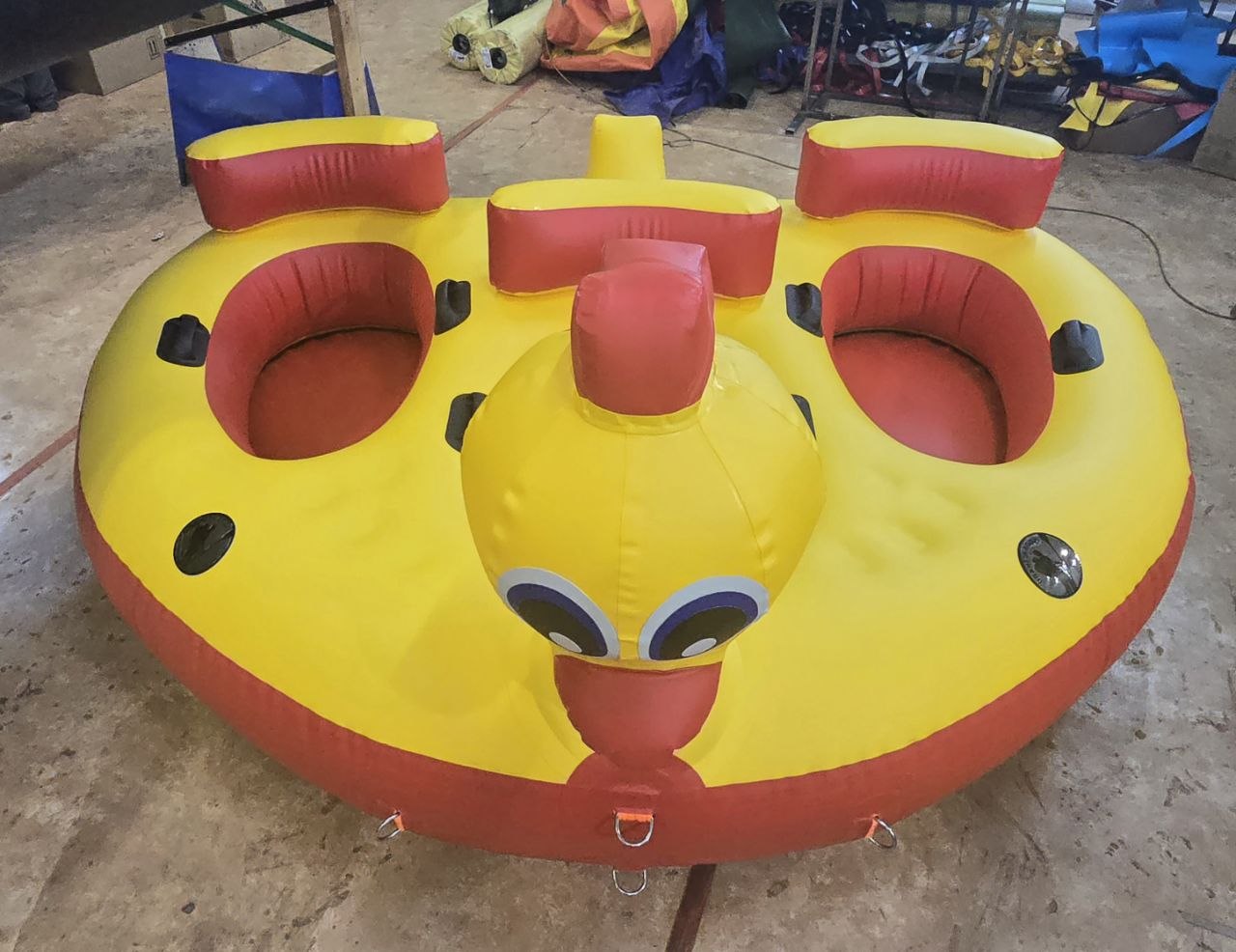 Надувной аттракцион «Водная ватрушка» один из самых известных и востребованных буксируемых аттракционов, используемых на воде в летнее время. Водная ватрушка производства «Планета Вода» можно использовать как в пресной, так и в морской воде.